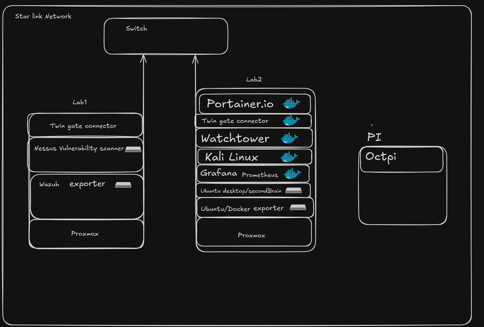 Overview of my homelab network with Nessus,Wazuh, and docker.